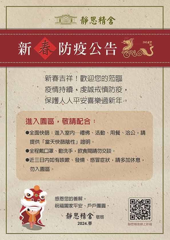 疫情持續,為了守護彼此的健康,前來體驗精舍年味的時候,請記得全程配戴口罩;進入精舍前的三日內,若有咳嗽發燒、感冒等症狀,請勿進入;進入室內禮佛、活動、用餐、洽公,也請出示當日快篩陰性證明。
