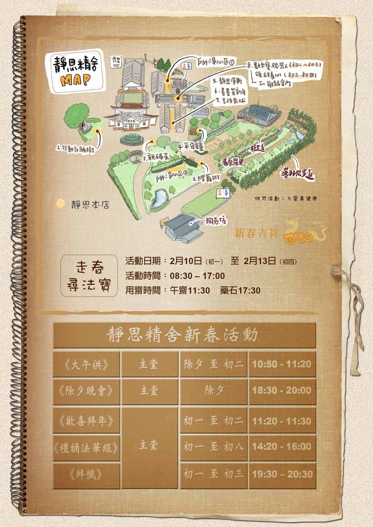 喜迎甲辰龍年,歡迎您闔家來精舍走春過「心」年!讓我們一起用感恩心送走過去,用歡喜心迎接未來。靜思精舍除了眾所期待的圍爐、晚會,還有歡樂的市集攤位與活動,初一到初五陪您一同溫馨迎春。