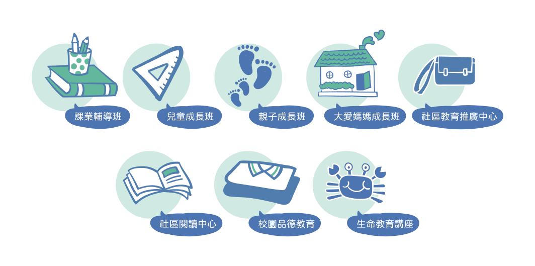 「教育要從小開始。」在訪視過程中,發現偏鄉教育資源不足,發現許多弱勢家庭孩子在生活自理及自我保護能力上略有不足,或是社區兒童、民眾之成長學習需求。因此,除了正規的完全教育,慈濟也深耕社區教育的人文素養,從兒童、青少年到成人,開辦各種課輔班、學習教育班、成長營隊等,從品格、生活、環保、生命教育、親職課程、志工服務等之教育學習,或藉由球類活動,輔以慈濟人文精神,我們透過一連串扶助計畫推動,無非是幫助弱勢孩子吃飽穿暖、健康長大,重拾安穩童年。